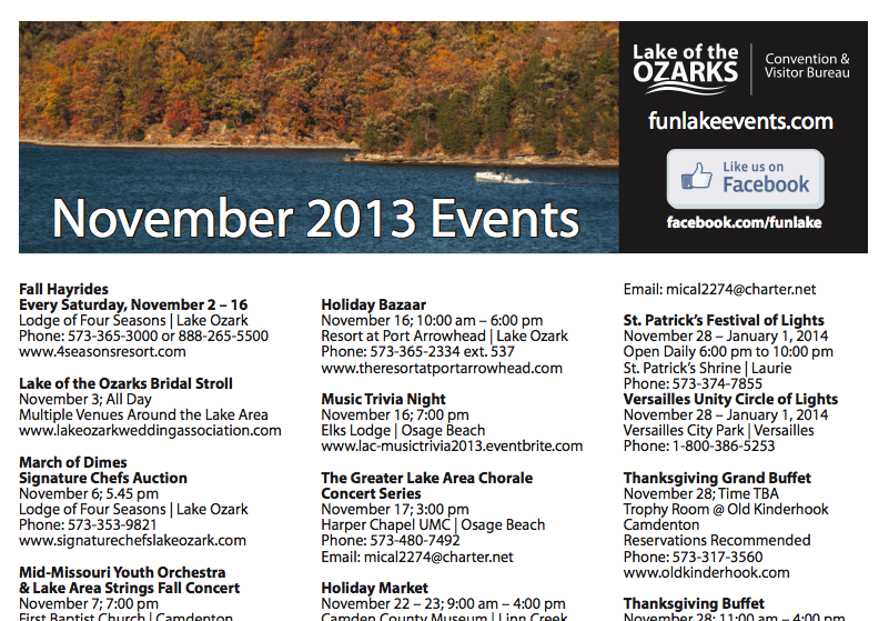 Anyway, we figured we’d give you an overview of what’s happening at the Lake of the Ozarks in November.